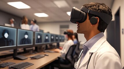 A healthcare professional wears a virtual reality headset, immersed in a medical training environment with a skeleton image displayed behind.