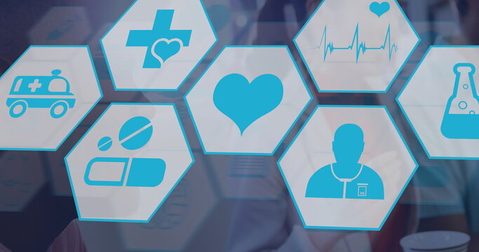 Futuristic Medical Team Collaboration in Hospital with Digital Technology Icons and Hexagonal Background, High Resolution Photography