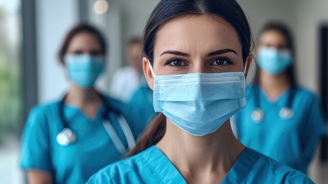 Diverse team of medical professionals including doctors and nurses wearing scrubs and personal protective equipment PPE such as face masks focused on healthcare procedures medical treatments