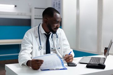 African american practitioner man looking at computer screen analyzing patient docuemnts with medical expertise on it. Therapist doctor working at healthcare treatment in hospital office