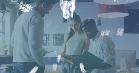 Team reviewing documents with digital data overlay in modern corporate workspace