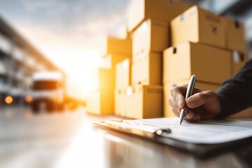 Close-up of a person's hand holding a pen and writing on a clipboard, wearing a safety reflective vest, with a delivery vehicle in the background.