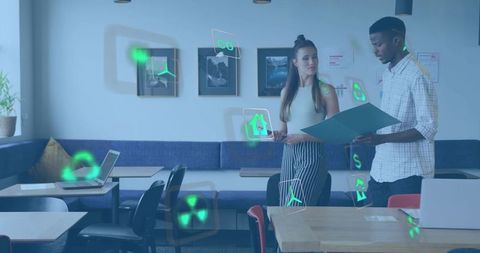 Young professionals reviewing documents in modern coworking lounge with digital icons