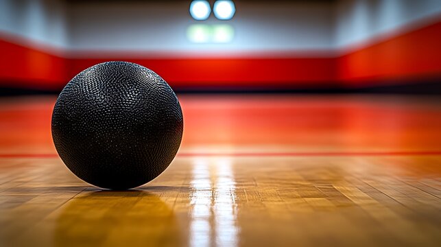 Red Dodgeball on Indoor Court Shallow Depth of Field Composition, Shiny Wooden Floor, Youth Game Action, Dodgeball Game, Indoor Sports Dodgeball, Indoor Games