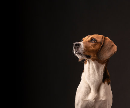 Portrait of a hunting dog made in the studio on a black background. Male Estonian hound, three years old. Close-up portrait. Copy space.