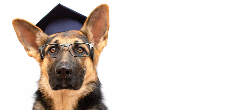 A German Shepherd dog wearing a graduation cap and glasses smart dog on white banner copy space