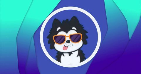 Smiling cartoon dog mascot wearing orange sunglasses on teal purple geometric badge emblem