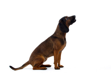 Close-up gazing brown dog portrait showing amber eyes detailed fur texture warm studio