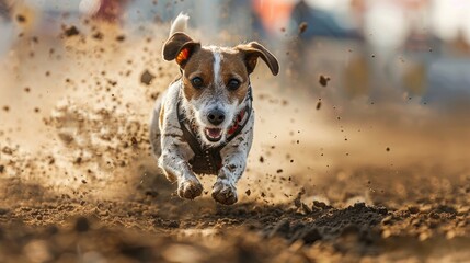 A brown and white dog runs through a dirt track, kicking up dust and mud as it races towards the finish line.