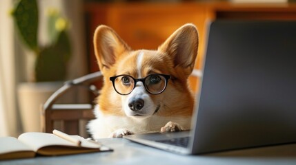 Cute corgi dog looking into computer laptop working in glasses and shirt