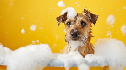 Dog Covered in Soap Bubbles dog grooming During dog Bath on Yellow Background