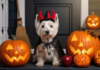Cute west highland white terrier dog dressed as a devil for halloween sits on a porch with carved pumpkins and a broom