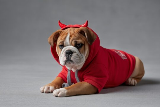 Bulldog wearing a red hoodie and small devil horns lies on a gray surface, showcasing a playful and mischievous character in a charming costume