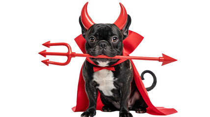 A small dog dressed in a red devil costume with black wings and horns, holding a small pitchfork, standing outdoors on a blurred path.