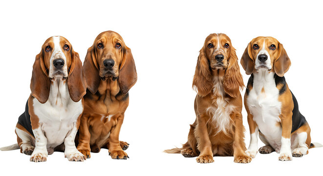 Group of christmas dogs wearing santa hats sitting with gift boxs and holiday sweaters isolated on a transparent background