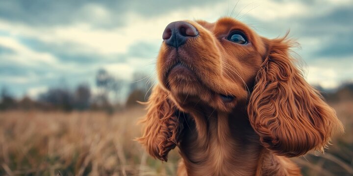 Close up of a red cocker spaniel dog with golden ears, nose raised high to sniff the air. This adorable red cocker spaniel enjoys exploring outdoors in a field on a cloudy day.