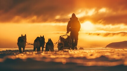 A man leads a dog sled team under the orange glow of a beautiful winter sunset in a snowy landscape.