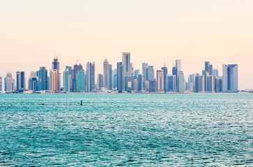 Iconic view of Modern Middle East city line with skyscrapers and white sand beach with blue water, panorama Doha city