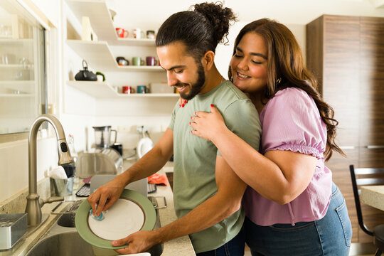 A young couple enjoying doing housework in the kitchen together. Kitchen, housework, home, relationship