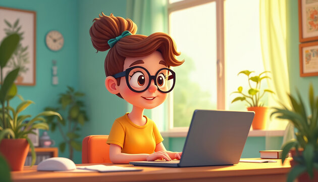 Young girl with glasses studies on laptop at home. Child sits at desk near window with plants. Kid does homework online. Education, remote learning, smart girl.