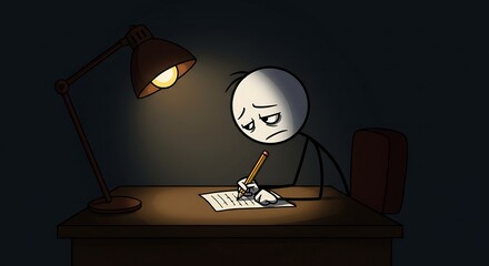 Stick Figure Writing at Desk Under Lamp with a Sad Expression