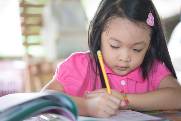 Little asian kid at home doing homework