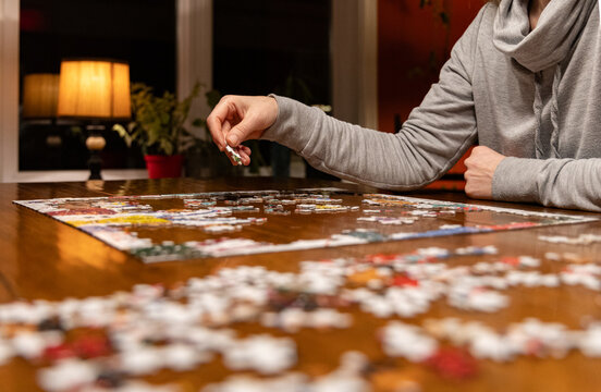 Hands of a little child and parent playing jigsaw puzzle game on a  table