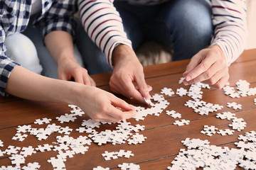 Hands of a child doing a puzzle at table