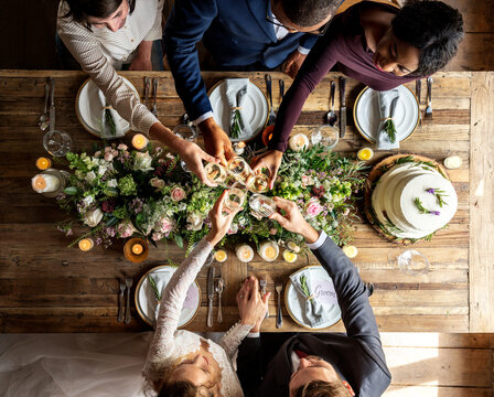 Happy adult friends having fun drinking red wine and eating together. Multiracial people doing lunch - Main focus on hands