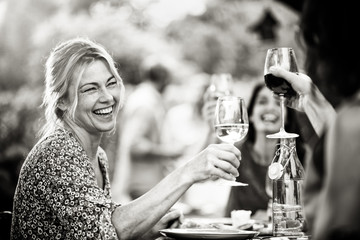 Woman holding wineglass doing celebratory toast at dinner party in backyard