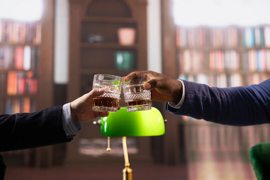 Two businessmen clinking glasses of whiskey and saying cheers, feeling excited about collaborating on making a fortune. Old money elite society members do business at social club. Close up.