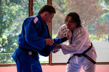 Grappling training session in judo dojo