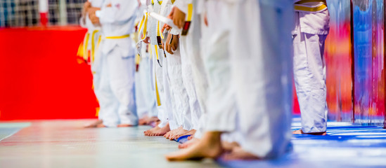 Martial arts Training Gym, Male Judoka in Dojo or Tournament. Sports Background with copy space,