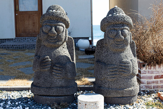 Close-up of harubang sculture at a park near the ocean of Jeju Island, South Korea.