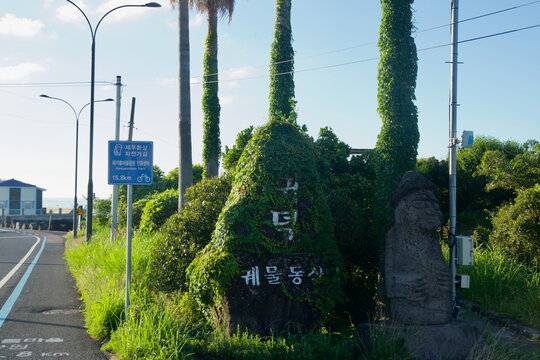Stone Dol Hareubang in Jeju Island and panorama of sea in South Korea