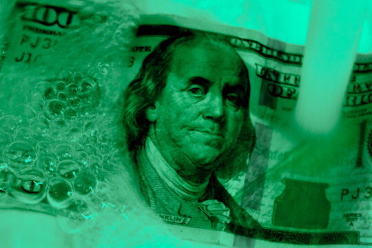 Benjamin Franklin portrait. Financial independence. Money success. Hundred US dollar bill. United States national currency banknote fragment.