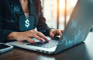 Businesswoman types on laptop with dollar sign graphic overlay. Corporate finance analysis, budget planning. Cost reduction, savings, financial strategy and profit optimization.