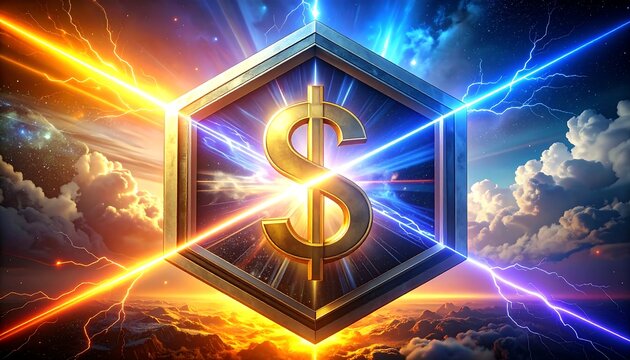 A golden dollar sign within a hexagonal frame is bathed in brilliant light, overlaid with streaks of orange and blue energy and atmospheric clouds