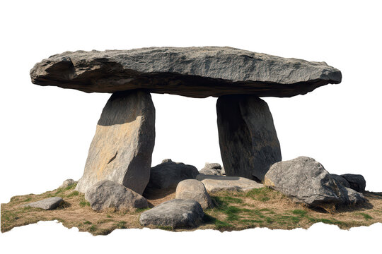 Isolated dolmen structure in a natural setting surrounded by stones and grass exhibiting ancient architectural significance