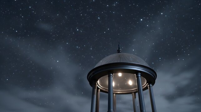 An ornate domed pavilion with internal lighting stands beneath a vast star filled night sky