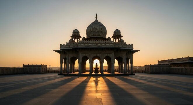 A majestic domed pavilion with intricate arches stands silhouetted against the golden light of sunrise, casting long shadows on the stone courtyard. The serene architecture suggests a spiritual or cul