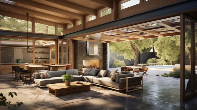 Light and airy indoor/outdoor living pavilion with glass wall systems vaulted ceilings organic wood accents and seamless courtyard flow.