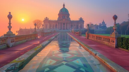 Heritage pavilion at sunrise in Madhya Pradesh lake surrounded by calm waters
