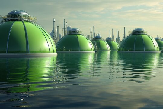 A nuclear power plant. two domes and several buildings that appear to be part of the same complex or facility. On one side are white concrete silos and towers, surrounded by green fields. Aerial view.