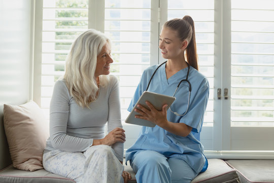 Docteur médecin en téléconsultation avec tablette et main du patient à domicile