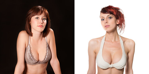 Closeup portraits of two beautiful women wearing a bra in front of white and black studio background