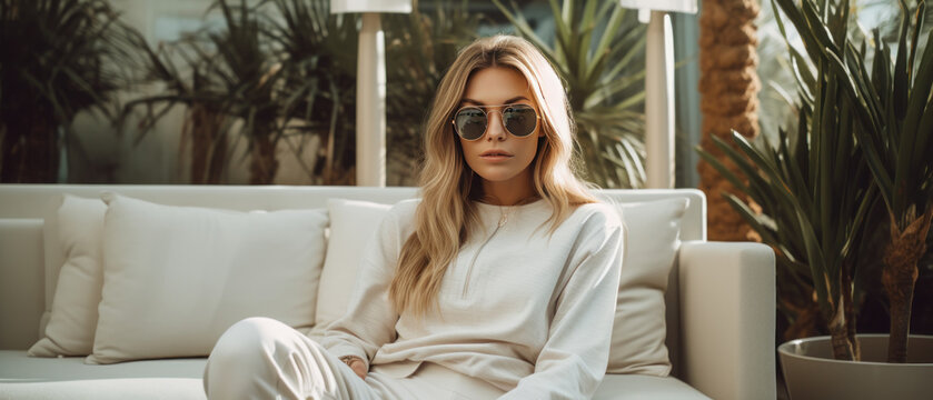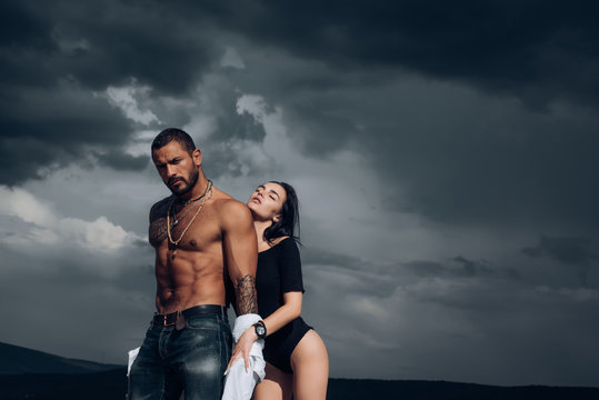 Young sexy couple in living room. Beautiful attractive young woman in black lingerie embrace man and look on camera. Businessman touch model with passion.