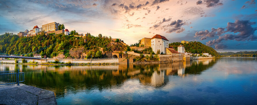 Panoramic view over the River Danube to the Fortress Veste Oberhaus in Passau, Bavaria, Germany