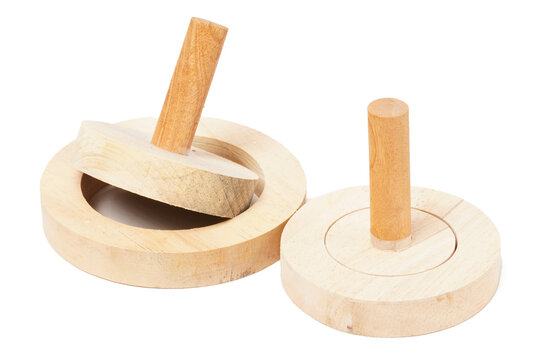 A wooden tool used to flatten donut dough, consisting of two parts: a ring to hold the dough and a round surface to press it flat. Photographed on a white background.