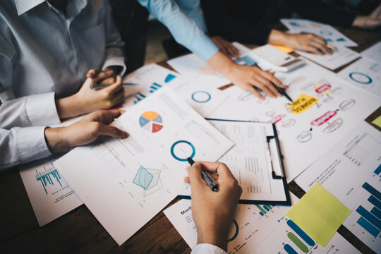 Close-up of businesspeople hands pointing a business plan data and donut chart, analyzing financial reports, team work concept.
